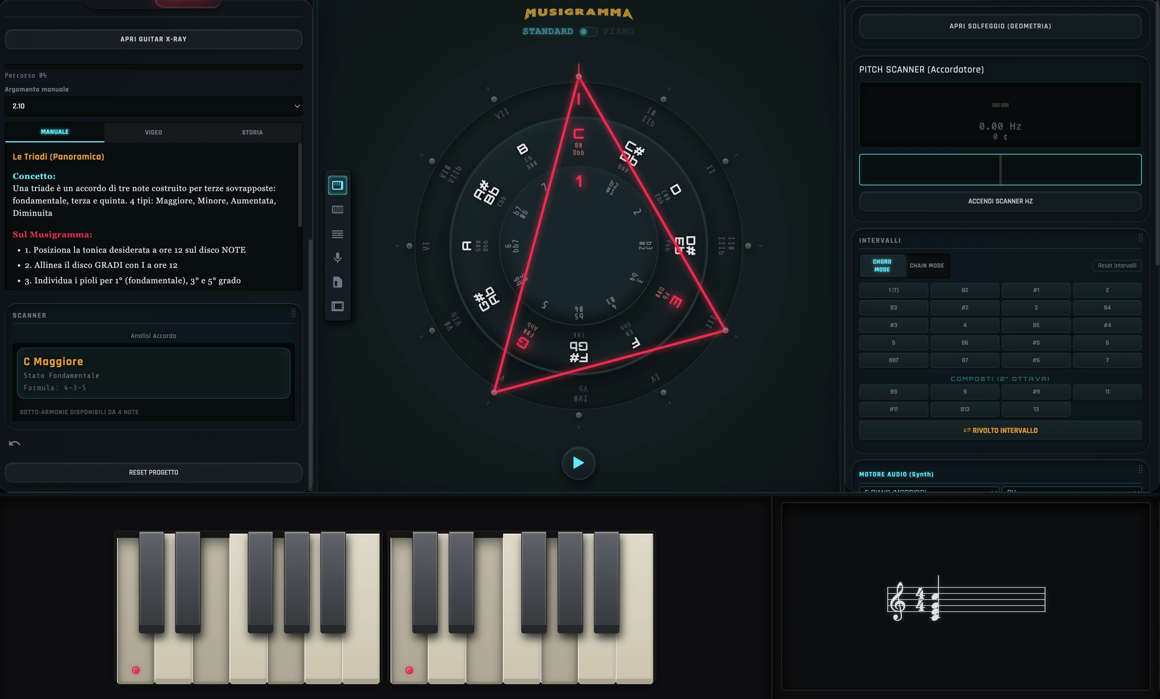 La grammatica delle distanze. Visualizza tensioni e risoluzioni, il peso di ogni nota prima di suonarla.